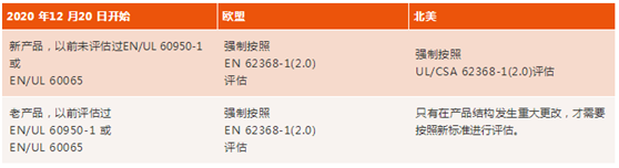 由各個授權的 NRTL 認證機構(gòu)獨立運作, 使用相同的標準 UL/CSA 62368-1(2.0)的要求,所以 2.0 版的強制實施日期由各家 NRTL 授權認證機構(gòu)自行決定。 通常各 NRTL 機構(gòu)會采納與 UL 發(fā)布的相同的實施日期。 目前 UL 發(fā)布的強制實施日期和歐盟的相同, 也是2020 年 12 月 20 日。但是有一個很大的不同點要注意, 此日期只針對新申請的產(chǎn)品或是老產(chǎn)品做了重大結(jié)構(gòu)更改(如主要電路改變)的情況, 對于已經(jīng)按照 UL/CSA 60950-1 和UL/CSA 60065 評估的產(chǎn)品, 如果未有重大結(jié)構(gòu)更改, 到了此日期以后, 不用強制升級評估 UL/CSA 62368-1(2.0)。