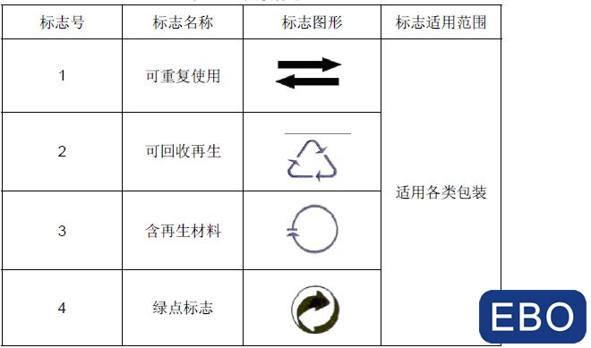 2001 年,強(qiáng)制性的國(guó)家標(biāo)準(zhǔn)GB18455-2001《包裝回收標(biāo)識(shí)》出臺(tái),并通過(guò)引用而成為《標(biāo)識(shí)標(biāo)準(zhǔn)》的一部分,解決了《標(biāo)識(shí)標(biāo)準(zhǔn)》關(guān)于包裝物名稱標(biāo)識(shí)的問(wèn)題。該標(biāo)準(zhǔn)引用了GB/T 16716-1996《包裝廢棄物的處理與利用通則》中的各項(xiàng)定義,對(duì)于包括塑料,紙張,木材等在內(nèi)的各種可回收復(fù)用及可再生利用的包裝標(biāo)志種類、名稱、尺寸、顏色都等作了明確的規(guī)定,大大增強(qiáng)了實(shí)際可操作性。其主要內(nèi)容概括如下: