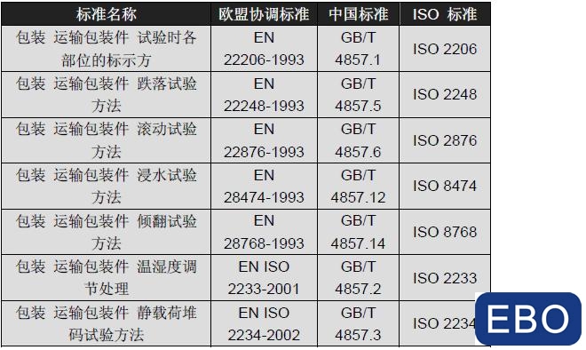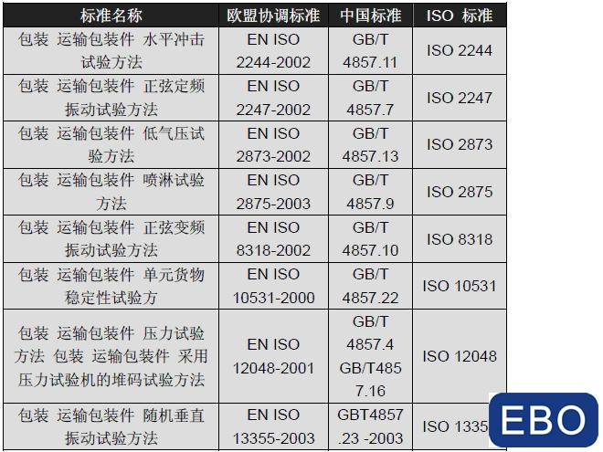 中國(guó)和歐盟協(xié)調(diào)標(biāo)準(zhǔn)關(guān)于運(yùn)輸包裝件試驗(yàn)方法同樣采用了ISO 國(guó)際標(biāo)準(zhǔn),見(jiàn)對(duì)照表10.2。