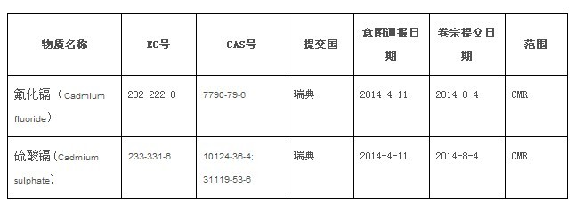 2014年5月,瑞典意圖向歐盟ECHA提交兩種SVHC提案物質(zhì),這兩種物質(zhì)分別為:氟化鎘和硫酸鎘。這兩種物質(zhì)的相關(guān)卷宗將在8月4日前提交給歐盟ECHA。相關(guān)情況如下表所示: