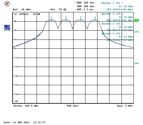 下面針對一款掃描機的測試進行介紹,該產(chǎn)品調(diào)制方式為ASK,功率為30±3dBm,有效工作頻點為:865.7MHz,866.3MHz,866.9MHz,867.5MHz。