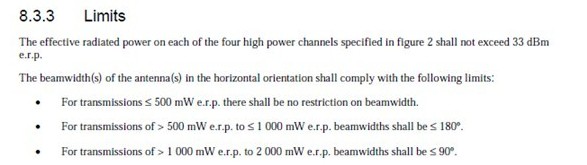 2:500mW至1000mW erp的,其發(fā)射機射束帶寬不超過180°;