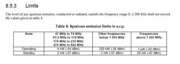 雜散發(fā)射的測試需要測試工作模式與待機模式,其限值有所不同,如下標(biāo)所示: