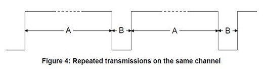 定義為發(fā)射機持續(xù)發(fā)射的周期時間,目的是驗證是否其在有效的進行發(fā)射。通過驗證產(chǎn)品的持續(xù)發(fā)射時間與停止發(fā)射的時間,來判斷其是否符合標(biāo)準(zhǔn)中的要求。持續(xù)發(fā)射時間A不能大于4S,發(fā)射間隙B不能小于100ms.
