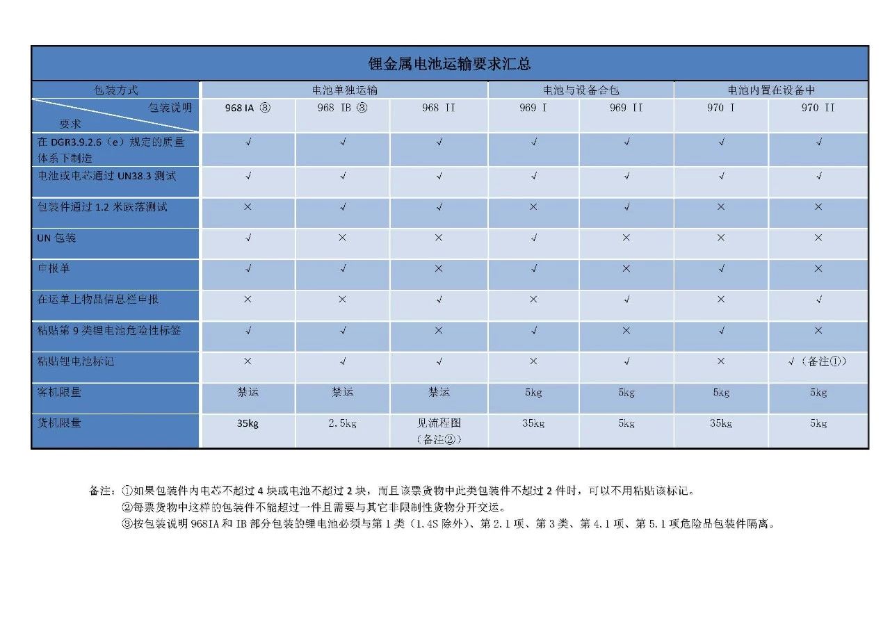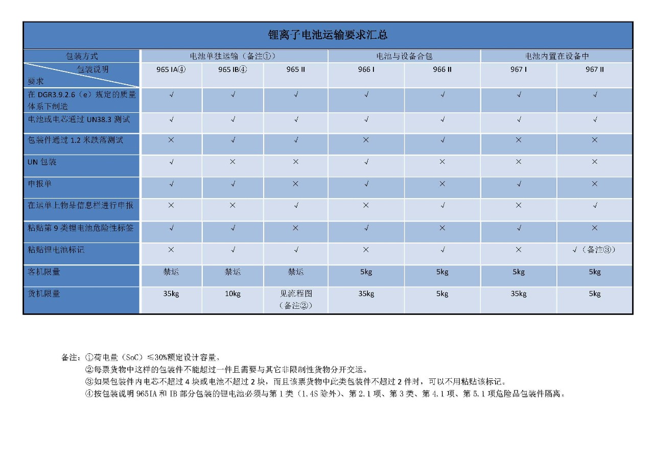 附圖是鋰電池在空運中的分類規(guī)則以及各種鋰電池在不同運輸方式下的要求匯總。
